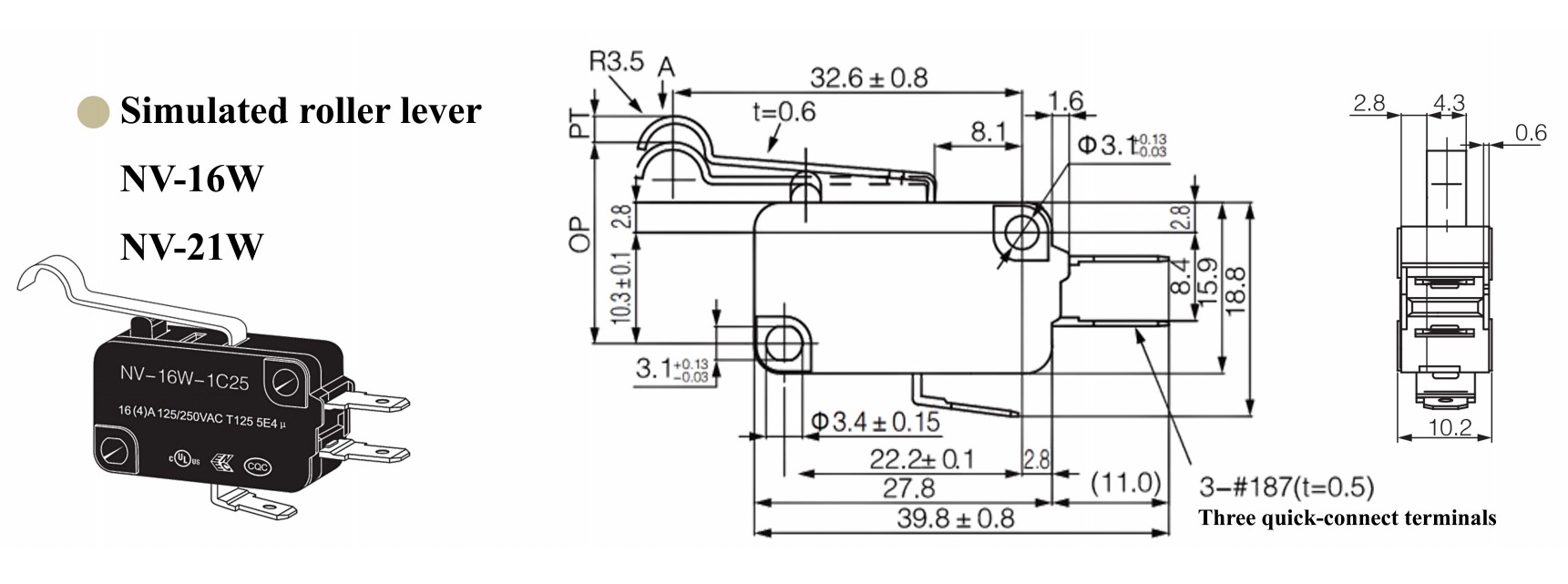 Der Micro Switch NV-16W ist ein hochmoderner Schalter, der fortschrittliche Funktionen kombiniert, um einer Vielzahl von Anforderungen gerecht zu werden.Mit seinem simulierten Rollenhebeldesign gewährleistet dieser Hochleistungsschalter eine präzise und zuverlässige Betätigung.Die Funktion beruht auf einem Hebel, der eine simulierte Rolle gegen eine Reihe von Kontakten bewegt und so eine präzise Steuerung und Erkennung ermöglicht.