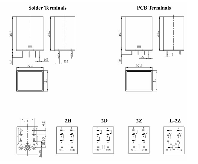 Kontaktformulare: Enthält Konfigurationen wie 2Z (DPDT), 3Z (TPDT), 4Z (4PDT), 2H (DPST-NO), 3H (TPST-NO), 4H (4PST-NO) und 2D (DPST-NC). Diese Formulare sind unterschiedliche Schaltanforderungen und eignen sich perfekt für vielfältige Verwendungen von Miniaturrelais.